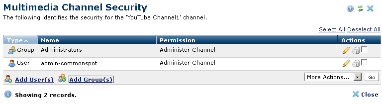 Use this dialog to view, change, or set new permissions for multimedia channels available to users at your site. Note that channel rights are also affected by upload rights to the target subsite and content rights. See the description of multimedia permissions for Sites and Subsites, See also Multimedia Playlist Security and Multimedia File Security. Access this dialog by clicking the security icon