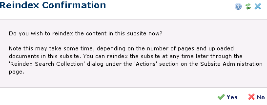 This message displays when you opt to automatically index a search collection. Note that the indexing collections for large sites with many pages or uploaded files can negatively affect system processing and performance.