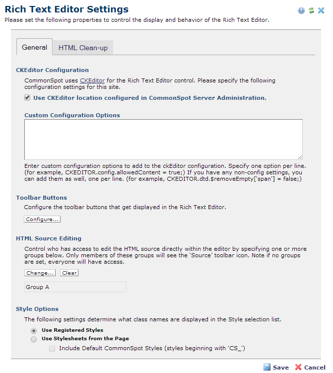 Use the Rick Text Editor Settings dialog to control the type and level of functionality available to content contributors. For example, you can show/hide HTML and other editing options, configure style sheet handling, spellcheck, and HTML cleanup and conversion settings.
