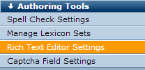 From the Site Administration left panel, click Authoring Tools - Rich Text Editor Settings to display Rich Text Editor Properties.