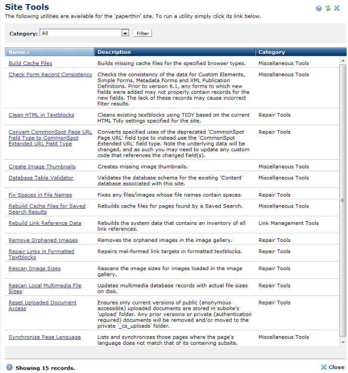 CommonSpot provides more than a dozen tools to automate common tasks such as converting an existing site to a replication target, link management, file repair, and general site maintenance. Choose Admin - Site Administration - Utilities - Site Tools to access maintenance and repair tools. Click to sort by column head. Pick from the Category dropdown, then click Filter to sort tools by function.