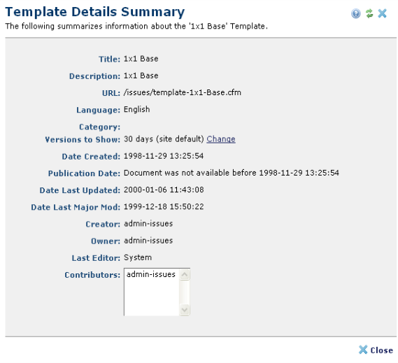 You can review detailed information for any template by opening that template and choosing Properties - Details. This option is also available as a Metadata & Security option in CommonSpot page and template reports. See Report of Pages, Templates, Uploaded Docs & Registered URLs and Report of Pages by Link Reference.