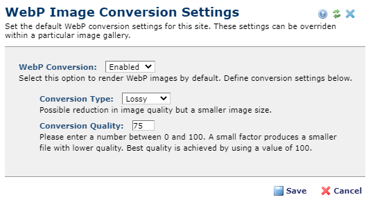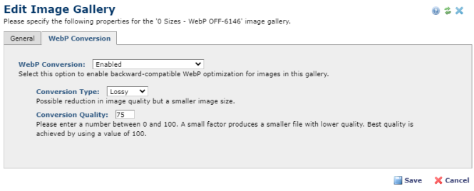 WebP Generation may be defaulted on or off at the Site level and overridden at each Image Gallery. The site-wide setting is found in Site Administration > Site Properties / Settings > WebP Image Conversion Settings. When WebP conversion is enabled for an Image Gallery, and a content contributor uploads a PNG, JPG, GIF or other supported image format as the base image into the gallery, CommonSpot will automatically generate and maintain a WebP image type for each size of the file in the gallery, except for the thumbnail. If the user uploads a WebP image as the base image, CommonSpot will automatically generate a PNG version and switch that to the base format. This way, for any image in a gallery that has Webp conversion enabled Commonspot will ensure each base image has a corresponding WebP image, so that both can be used in a picture tag to safely render the image for backward compatibility. After enabling WebP you should run the ‘Generate WebP Images’ utility to generate the WebP images for any existing images.