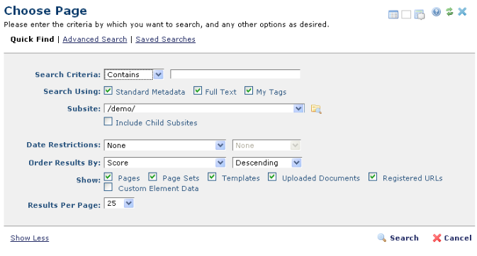 Search Using - These options vary according to the content type targeted by the current Choose or Find operation. Select all for the broadest search, or filter using Metadata (Properties), your full-text search criteria, or your personal tags.