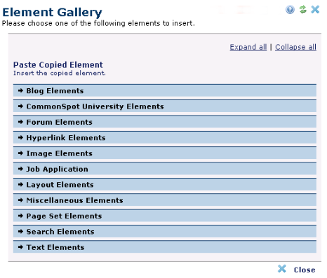 The element you copied now displays in the Element Gallery dialog above the list of available element categories as Copied Element.