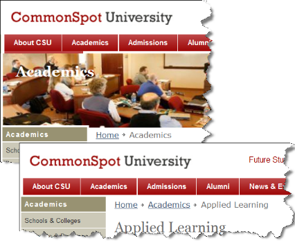 The CommonSpot University demo site shipped with PaperThin uses Breadcrumbs on its web pages. Here are the top left portions of two web pages. Notice how the Breadcrumbs change when a page at a different level in the site’s hierarchy displays.