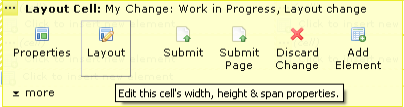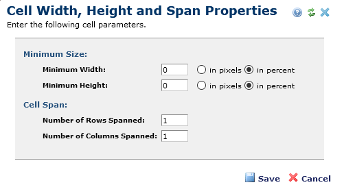 The Cell Width, Height and Span Properties dialog allows you to set the minimum width and height of the cell and enter the number of rows and columns the cell should span across. You can access it using the Layout icon.