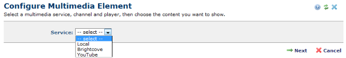 Service: Displays the video services defined for your site. Administrators configure availability through Multimedia Services. Select from the dropdown and click Next to display the following Channel and Player configuration options.