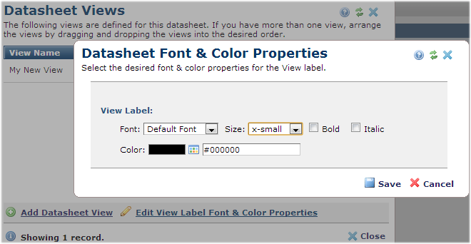 The Datasheet Font & Color Properties dialog is only available when style sheets are turned off for the page containing the Datasheet Element. When this is the case, the Datasheet Views dialog displays an option to Edit View Label Font & Color Properties, as shown below.