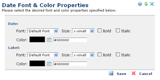 If your site is not using style sheets, click the Element Tool icon and then select Font. The Date Font & Color Properties dialog lets you set font and color properties for a date.