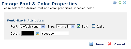 If your site is not using style sheets, click the Element Tool icon and then select Font. The Image Font & Color Properties dialog lets you set font and color properties for the image’s caption. It does not change font and color properties for text within the image.