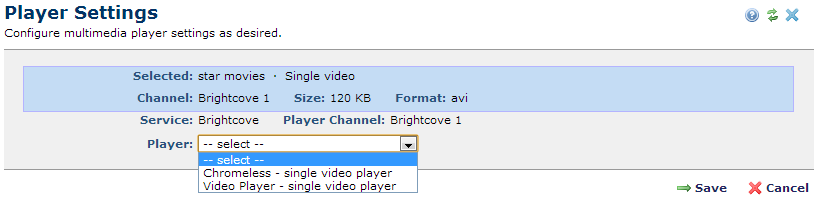 Once you pick the appropriate player, you can optionally view or change additional player attributes. These properties are both service- and player-specific and are also controlled by editability settings made at the administrative level. See the descriptions for configuring YouTube, Brightcove, and local multimedia and multimedia players in the Administrator's Reference.