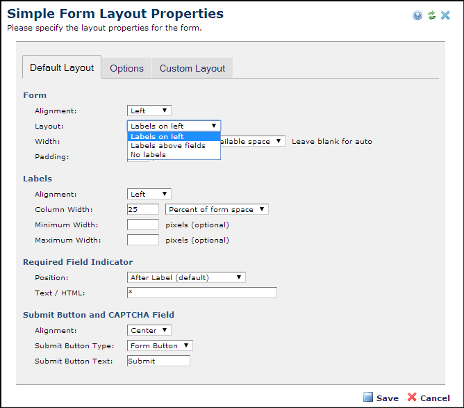 The Simple Form Layout Properties dialog provides flexible capabilities for controlling the format structure for the form layout, to meet the needs of the page and content. Display this dialog by selecting Layout from the Element menu within a page.