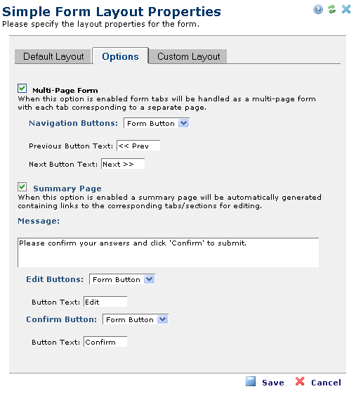 The Options tab of the Simple Form Layout Properties dialog provides two additional options to customize the layout of your form.
